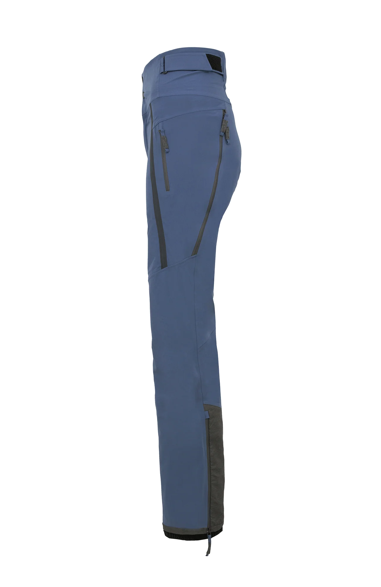 Die Oberfläche ist mit der technischen Membran und dem Futter verbunden. Die Nähte sind wasserdicht verschweißt. Umfassende Funktion bieten der Kantenschutz aus Alcanataraleder, die Zipper, die fast bis zu den Knien reichen, sowie der Schneefang mit Gummibund. Das Rumpfteil ist etwas höher geschnitten und reicht bis über die Taille. Mit einem Klett lässt sich die Bundweite individuell anpassen. Die beiden Knöpfe wurden asymmetrisch angebracht, was die Taille optisch schmäler wirken lässt. Wird es während einer Schneetour wärmer oder kommt man auf der Piste ins Schwitzen, kann man die Zipper an der Beinrückseite öffnen.