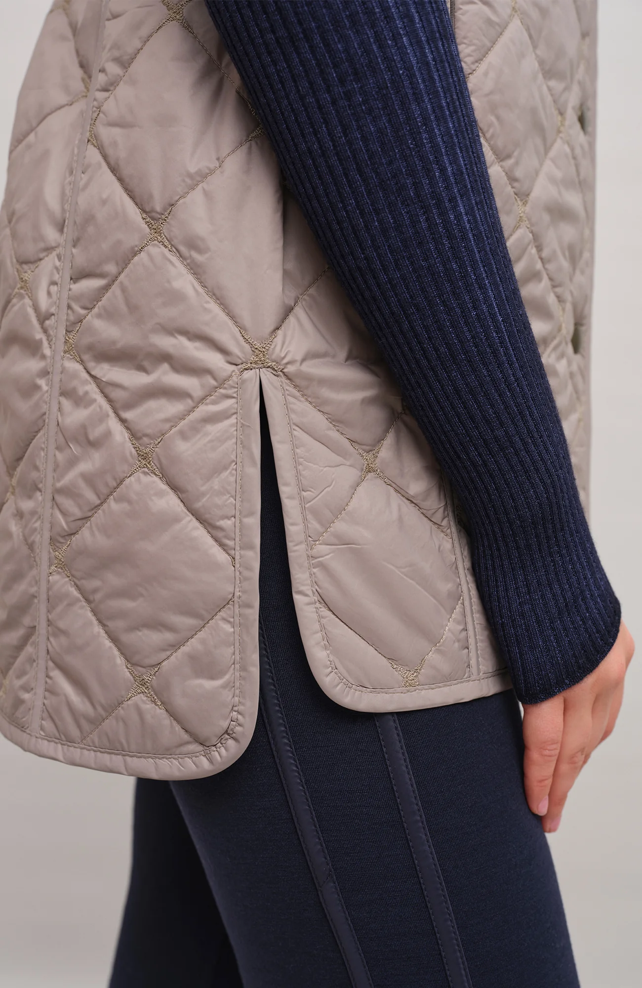 Neben ihrer Funktionalität wie etwa der wärmenden, wasser- und schmutzabweisenden Wirkung, überzeugt die ärmellose Weste mit ihrer Optik. Feinstes italienisches Nylon wurde mit klassischem Rautenmuster gesteppt. Außerdem lässt sie sich ganz klein zusammenfalten, um easy in Taschen oder Rucksäcken verstaut zu werden. Dank ihrer praktischen Länge ein perfekter Reisebegleiter.
