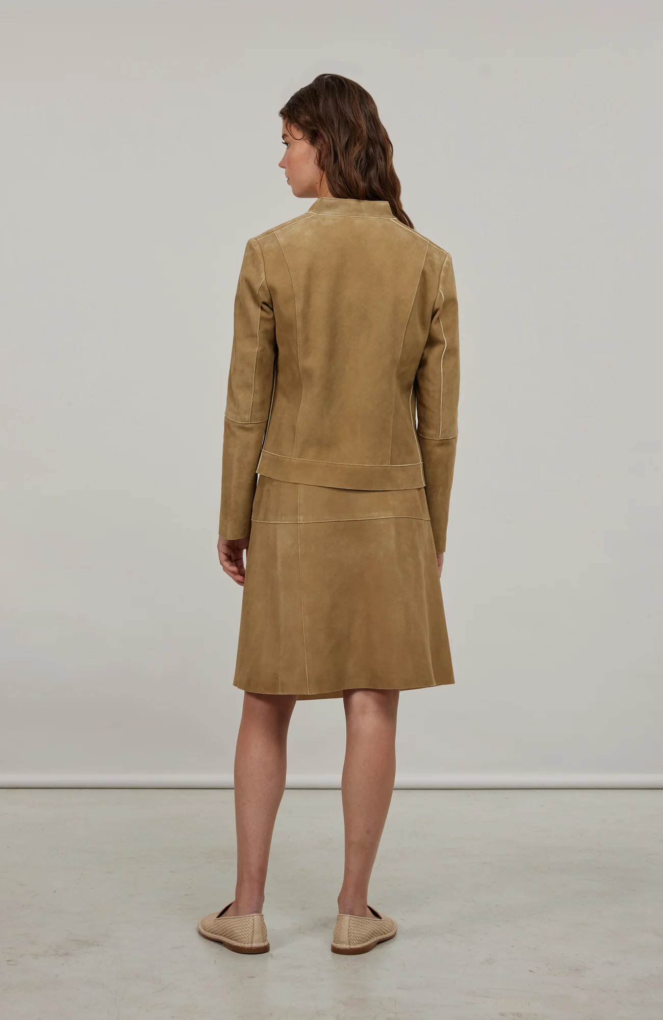 Dieser modische Wickelrock aus ökologisch gefärbtem und gegerbtem Lammvelours liegt anschmiegsam auf der Haut. Das Leder wickelt sich lässig verspielt, in asymmetrischer Länge mit geometrisch verlaufenden Patchwork-Nähten, um die Beine und bewirkt eine schlanke Linienführung. Optimalen Halt gibt der, mit einem Ripsband verstärkte, feste Bund und die zwei Sicherheitsdruckknöpfe an der Seite. Für noch mehr Tragekomfort wurde der Lederrock teilgefüttert.