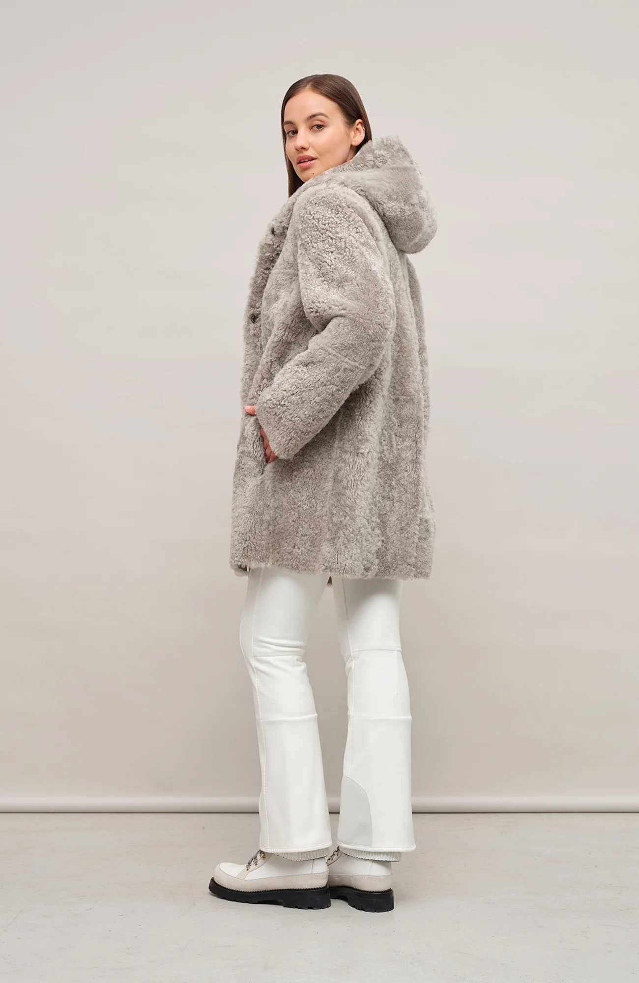Der Lammfellparka bietet zwei verschiedene Tragemöglichkeiten: Man kann die Fellseite nach außen tragen oder den Parka mit wenigen Handgriffen wenden und dadurch die Glattlederseite nach außen tragen. Durch diese Wendetechnik hat man quasi zwei Parkas in einem. Auf beiden Seiten sind großzügige, sehr praktische Eingriffstaschen angebracht. Auf der Glattlederseite mit seitlichem Eingriff, auf der Fellseite sehr markant mit Einstieg von oben. Von Hand angenähte, auffallend große Metalldruckknöpfe sind neben den versetzten Quernähten auf der Rückenseite ein auffallendes Designelement.